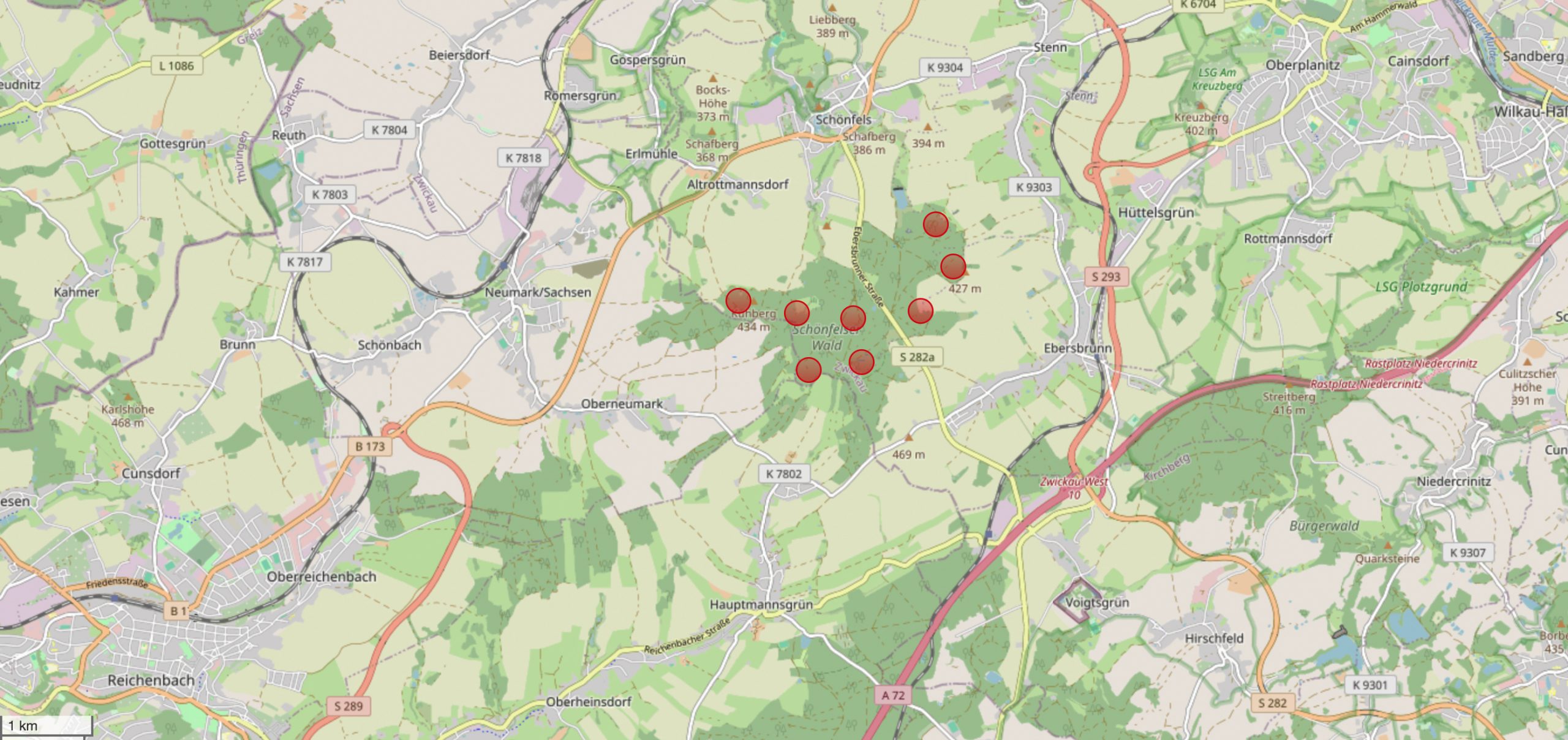 Der offizielle Planungsstand gemäß der öffentlichen Infoveranstaltung vom 07.03.2024 in Schönfels, zeigt das enorme Ausmaß der insgesamt 8 Windräder im Schönfelser Wald. Die folgende Karte obliegt den Plänen, die von den Planern offiziell vorgestellt wurden.